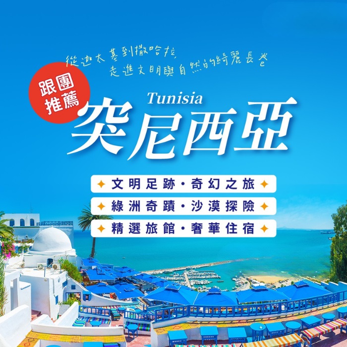 突尼西亞 搜出好團 請選擇旅遊細項 東歐 中西歐 南歐 北歐 中東 非洲 遊輪 美洲 紐西蘭.澳洲 中國大陸 南亞 海島 東南亞 日本 河輪 韓國 俄羅斯.中亞.蒙古國 請選擇旅遊細項 相關地區 埃及模里西斯.馬達加斯加南非東南非.多國阿爾及利亞納米比亞.衣索比亞肯亞.坦尚尼亞摩洛哥 超值行程 大圖示 . 小圖示 藍白突尼西亞 撒哈拉 星際大戰10天✈阿聯酋國際航空▸沙漠綠洲帳篷旅館▸馬賽克博物館、麥地那市集、星際大戰場景▸柏柏人穴居建築、藍白小鎮漫遊▸吉普車沙漠綠洲之旅 04/08、04/19、05/06... 89,900 突尼西亞 風沙歲月・拾光之旅 11日TK✈土耳其航空▸六晚五星+沙漠帳篷▸巴杜博物館、星際大戰場景▸吉普車沙漠綠洲之旅▸撒哈拉騎駱駝、柏柏人地下城市 03/13... 88,900 阿提哈德 突尼西亞 撒哈拉沙漠 迦太基 怪怪屋14日✈阿提哈德航空▸異國情調:傑爾巴島.吉利特鹽湖.瑪特瑪它▸文明巡禮:迦太基遺址.麥迪納古市集.雪尼尼.巴杜博物館▸吉普車沙漠綠洲:雪碧加沙漠瀑布.米德斯.Oung Jamel▸地道美食:布里克炸蛋春捲.北非風情小米飯.突式風味濃湯▸精選旅宿:六晚五星飯店及地中海飯店+一晚沙漠帳篷 03/23... 106,900 突尼西亞 撒哈拉沙漠 迦太基 怪怪屋11日✈土耳其航空▸異國情調:地中海風情西迪博賽德.吉普車穿梭沙漠▸文明巡禮:迦太基遺址.史貝特拉.麥迪納古市集.巴杜博物館▸自然絕景:撒哈拉綠洲杜茲.吉利特鹽湖.塔馬札峽谷▸地道美食:北非風情小米飯.布里克炸蛋春捲.Shoraba突式風味濃湯▸精選旅宿:四晚五星(含堡壘飯店LA KASBA HOTEL).一晚渡假村體驗帳篷旅館 ... 來電洽詢 突尼西亞 風沙歲月・拾光之旅 10日★請1休10 、8月底前付訂早鳥每人優惠5000元★▸六晚五星+沙漠帳篷旅館▸吉普車沙漠綠洲之旅▸突尼西亞不思議~世界遺產、柏柏人的特有建築、星際大戰電影場景一次全纜、世界最大的羅馬馬賽克博物館~巴杜博物館、麥地那市集 ... 來電洽詢 北非藍與白 傑爾巴島 突尼西亞撒哈拉14天✈阿提哈德航空▸藍與白~阿拉伯世界的聖托里尼:傑爾巴島▸金色撒哈拉:Sahara Desert撒哈拉沙漠▸經典必遊:比塞大.邦角半島.巴杜博物館.吉利特鹽湖.迦太基遺址.古羅馬遺跡群.蘇斯博物館▸北非專屬:騎乘駱駝.沙漠吉普車之旅.柏柏人穴居.怪怪屋.西迪博賽德 ... 來電洽詢